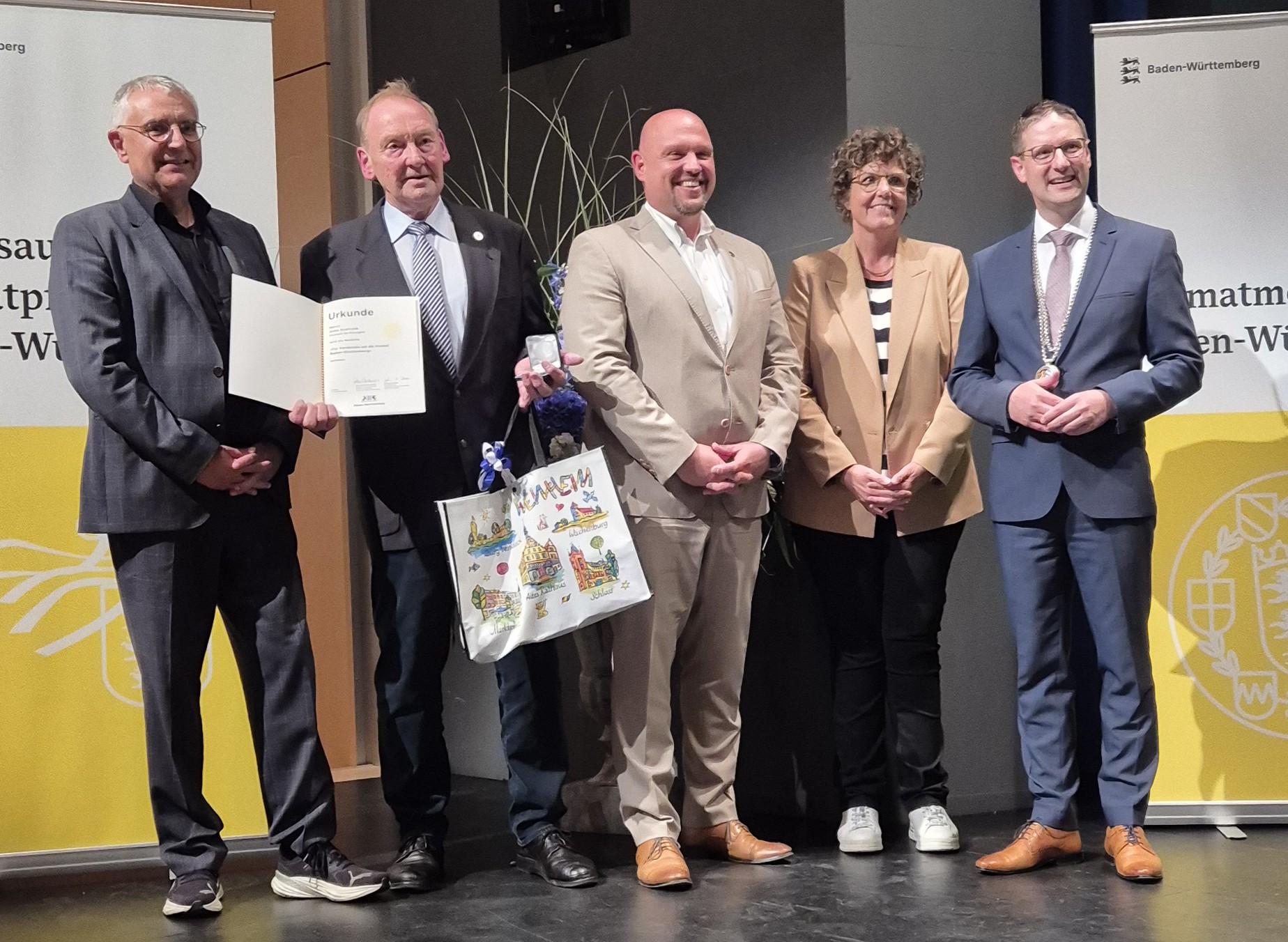 Haslach/Weinheim (red/mb). Eine ganz besondere Ehrung erhielt am Freitag 14.09.25 Alois Krafczyk aus Haslach: Zum Start der Landesfesttage in Weinheim hat Staatssekretär Arne Braun zehn Bürgern die Heimatmedaille Baden-Württemberg verliehen. „Mit ihrem herausragenden Engagement machten sie Heimat erlebbar und stärken das Miteinander im Land“, schrieb das Ministerium für Wissenschaft, Forschung und Kunst Baden-Württemberg in einer Pressemitteilung. „Heimat ist nicht immer etwas Festes, Stabiles, Abgrenzung ist sogar das Gegenteil davon: Heimat ist nicht, die und wir, sondern nur, wir“. Deswegen zeichnen wir die Menschen aus, die Heimat bewahren, neugestalten – und so die Gesellschaft mit Leben füllen“, wird Braun zitiert. Eine Heimat zu haben, sei ein großes Glück. Die Träger der Heimatmedaille „schaffen Orte der Begegnung, stärken Dorf- und Stadtgemeinschaften und fördern Akzeptanz und demokratische Teilhabe“, heißt es in der Mitteilung. Alois Krafczyk erhielt die Auszeichnung, weil er sich seit vielen Jahren in vielfältiger Weise für die Brauchtumspflege engagiert. Als Leiter des „Schwarzwälder Trachtenmuseums“ sei er ein gefragter Experte auf dem Gebiet der Schwarzwälder Tracht. Jahrelang war er als Initiator und Mitorganisator für Stadtfeste und Fastnachtsspiele tätig und hat sich für die Wiederbelebung und den Erhalt mehrerer religiöser Bräuche und Feste in Haslach eingesetzt. Hervorgehoben wird auch sein Engagement als Kapellenpfleger für den Erhalt der Loretokapelle und für weitere Kapellen in Haslach – ebenso wie seine kenntnisreichen und unterhaltsamen Stadtführungen und Artikel. Auch Krafczyks Engagement in der Fasnacht wird gewürdigt: So hatte er sich über viele Jahrzehnte auf Verbandsebene als Experte im kulturellen Beirat der Vereinigung Schwäbisch-Alemannischer Narrenzünfte (VSAN) eingebracht sowie vor Ort beispielsweise bei den Hemdglunkern, er war Oberhemdglunker, Texter der närrischen Gerichtsverhandlung und beim Narrenblättle. Ein weiterer langjähriger Schwerpunkt seiner Tätigkeit ist die Beschäftigung mit dem Werk und dem Leben von Heinrich Hansjakob. Er war bei verschiedenen Anlässen Darsteller des Schriftstellers, Theologen und Politikers und aktiv in der Heinrich-Hansjakob-Gesellschaft. Krafczyk war bewegt ob der seltenen Auszeichnung und freute sich besonders, dass Bürgermeister Armin Hansmann eigens nach Weinheim gekommen war, um ihm seine Glückwünsche persönlich zu überbringen.
